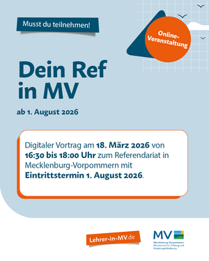 Am Mittwoch, den 18. März 2026, um 16:30 Uhr informieren Cindy Plüm und Kolleg/innen von der Referendariatseinstellung des Ministeriums für Bildung und Kindertagesförderung per Videokonferenz über Webex über den Eintrittstermin 1. August 2026. Darüber hinaus wird Mathias Hofmann vom Institut für Qualitätsentwicklung M-V einen Einblick in den Ablauf des Referendariats geben und hilfreiche Informationen sowie praxisnahe Tipps mit euch teilen. Nach einem Input (und auch schon währenddessen) können individuelle Fragen im Chat gestellt werden, die anschließend in einer Frage- und Antwort-Runde beantwortet werden.