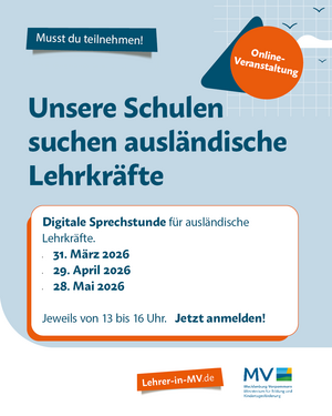Am Mittwoch, den 18. März 2026, um 16:30 Uhr informieren Cindy Plüm und Kolleg/innen von der Referendariatseinstellung des Ministeriums für Bildung und Kindertagesförderung per Videokonferenz über Webex über den Eintrittstermin 1. August 2026. Darüber hinaus wird Mathias Hofmann vom Institut für Qualitätsentwicklung M-V einen Einblick in den Ablauf des Referendariats geben und hilfreiche Informationen sowie praxisnahe Tipps mit euch teilen. Nach einem Input (und auch schon währenddessen) können individuelle Fragen im Chat gestellt werden, die anschließend in einer Frage- und Antwort-Runde beantwortet werden.